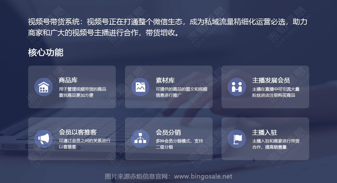 視頻號帶貨系統:視頻號正在打通整個微信生態,成為私域流量精細化運營必選,助力商家和廣大的視頻號主播進行合作,帶貨增收。