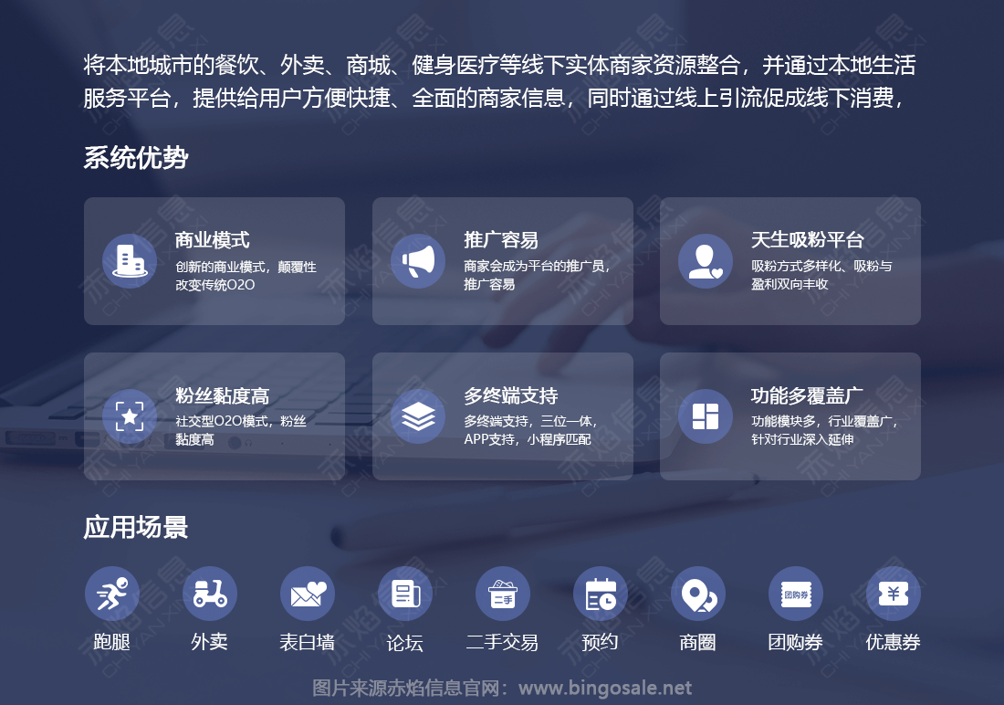 將本地城市的餐飲、外賣、商城、健身醫療等線下實體商家資源整合,并通過本地生活服務平臺,提供給用戶方便快捷、全面的商家信息,同時通過線上引流促成線下消費,為線下實體商家提供免費的推廣渠道。
